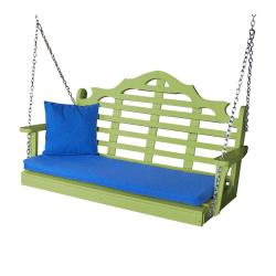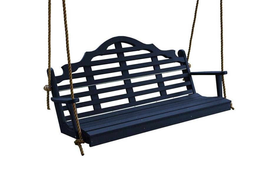 Amish PolyCraft Marlboro Porch Swing Handcrafted swing is constructed with one inch thick poly materials. Delightful detailed design, match with bench and glider. Hardware & chain are stainless steel. Chain and rope kits are designed to hang swing from 8 foot high ceilings.