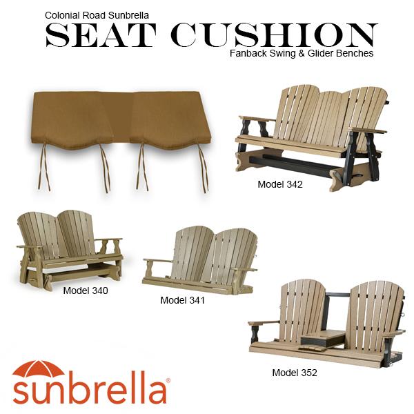 992 & 993 Colonial Road Fanback Glider and Swing Seat Cushions made from Sunbrella Upholstery fabrics. All fabrics are stain, fade and water resistant making them tough as they are beautiful. Each cushion is designed using the furniture blueprint for that model and will custom fit only the Colonial Road furniture. Cushions have sewn in ties and are 1.5" thick. Inner cushion core allows water to wick through to keep dry, while durable outdoor Sunbrella fabric is double stitched and clads the foam core.