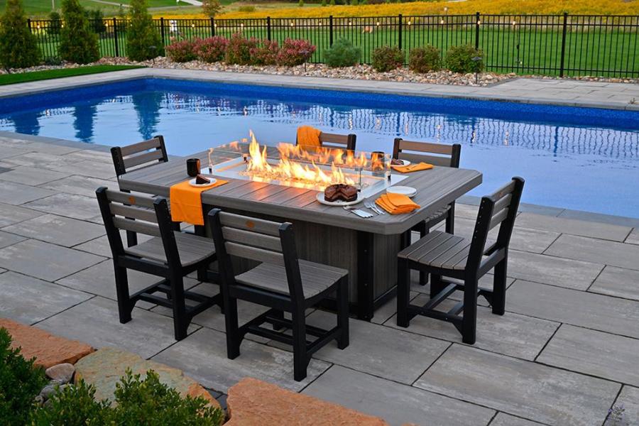 Luxury Poly Furniture 7 Piece Lumin Fire Table Dining Set Mare more room for memororable evenings under the stars with this Fire Table set. Clean burning flame with just a push of the button. Fire table comes with tempered glass wind guard and tempered fire glass gems. Table is set up for liquid propane or with included conversion kit can be set to accept Natural gas. Perfect for entertaining up to 6 dinner guests, this rectangular table is available in Dining Height. 50" x 79" Matching Island Side chairs ship fully assembled to you from the factory.
