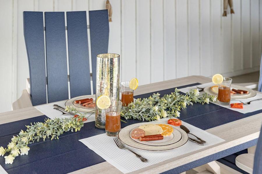 Poly Concepts 5 Piece Country Comfort Dining Set Set includes a 5 foot rectangular dining height table with 2 x 4 extra thick poly legs and supports. Comes with or without a 2 1/4" diameter umbrella hole. Matched with four modern design armed dining chairs. Ideal for up to 4 guests this compact dining table set will make a statement on any outdoor deck, patio or backyard setting.
