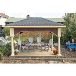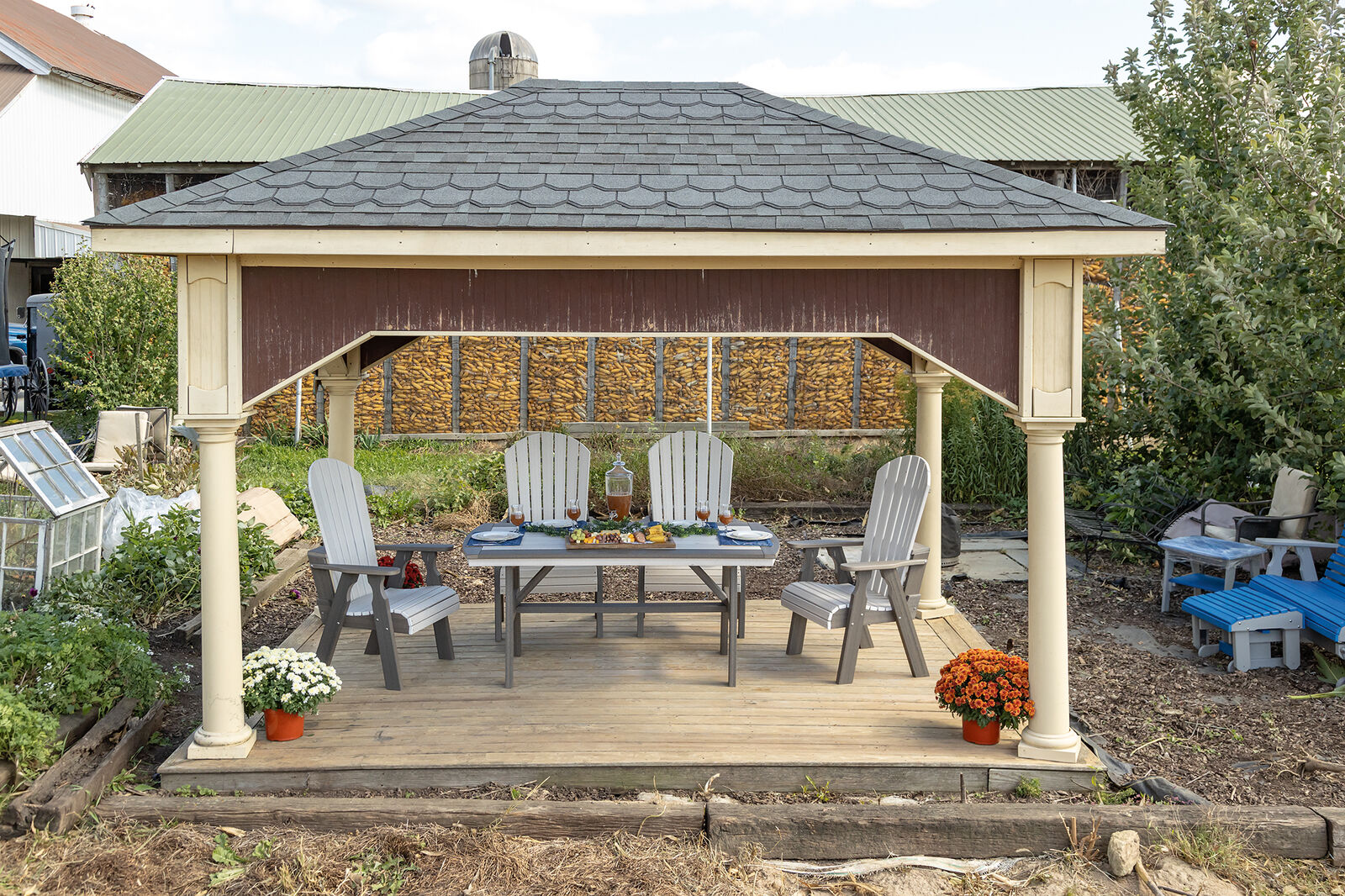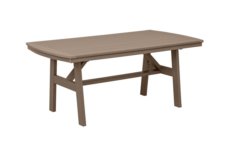 Poly Concepts 7 Piece Fanback Dining Set Set includes a 6 foot dining height table with oval ends. 2 x 4 extra thick poly legs and supports. Comes with or without a 2 1/4" diameter umbrella hole. Matched with 6 oversized Fanback Dining Arm chairs as shown. Ideal for up to 6 guests this heavy duty poly dining table set will make a statement on any outdoor deck, patio or backyard setting.