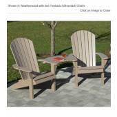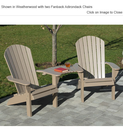 Poly Concepts Furniture Settee Table Made from the durable poly lumber material. This table can turn two Poly Concept Fanback Adirondack chairs into a Settee in seconds. Table attaches by sliding up and under the arms of two Fanback chairs via a installed plastic bracket. Table can be quickly removed or installed as needed in one easy step!